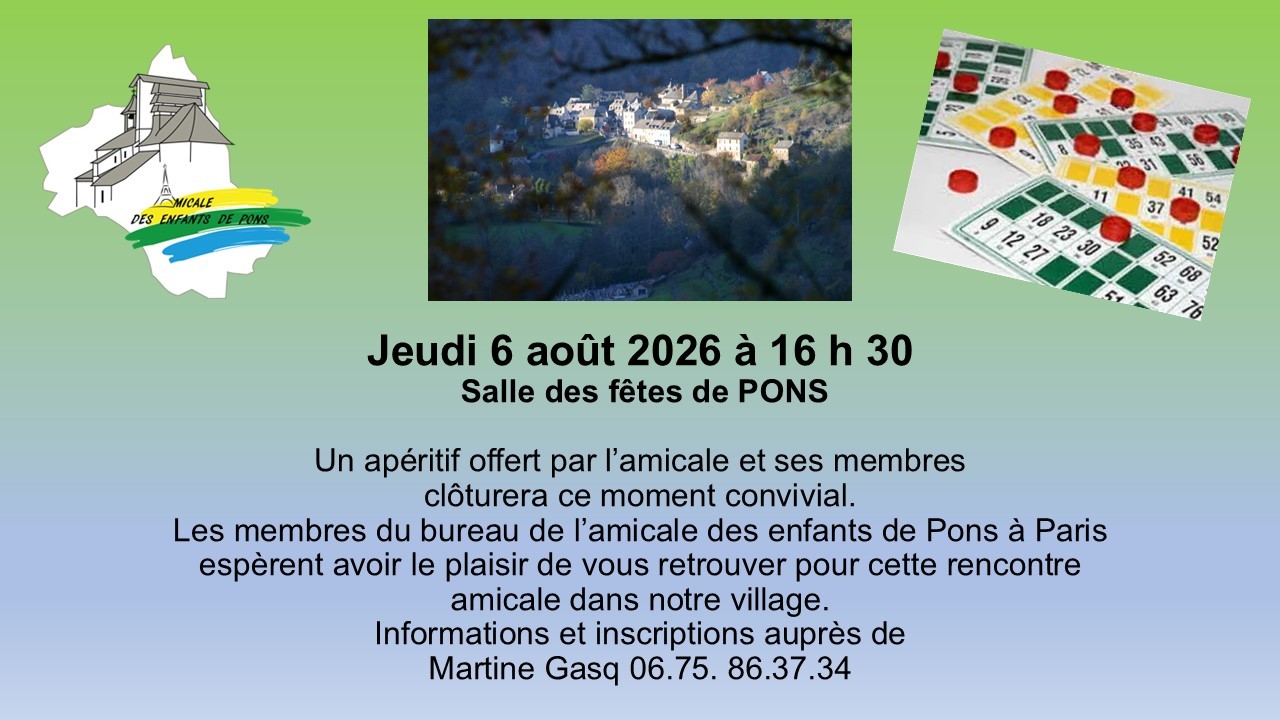 L’amicale des enfants de Pons à Paris souhaite maintenir, entretenir, élargir les liens et échanges entre tous les originaires de notre village et des hameaux environnants à travers des rencontres diverses à Paris et en Aveyron.